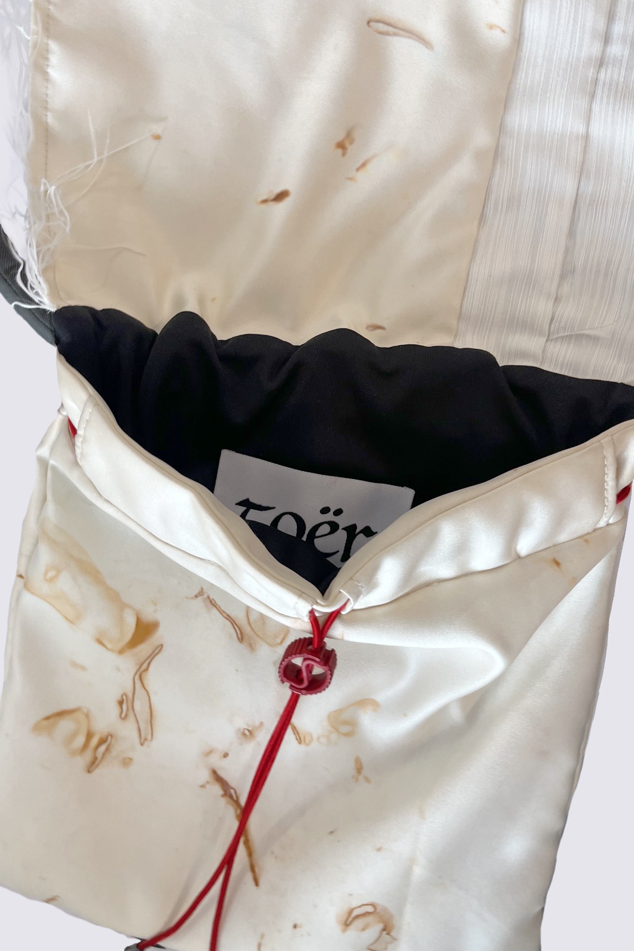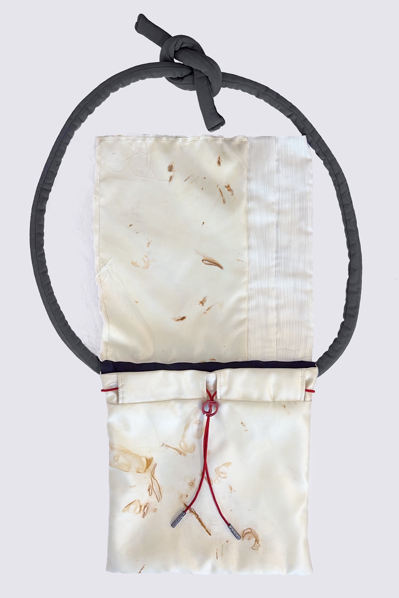Off white satin pouch bag with hand stained distressed details, frayed edges and textured side panels in matte white cotton containing embroidered lettering. Interior pocket lined with black cotton. The red elastic cord, with dark metallic ends, on the inside of the bag, keeps your items safe and changes the shape of the bag into a pouch when pulled tight. The bag comes with an adjustable tube strap in light grey, that can be knotted into any desirable fit.