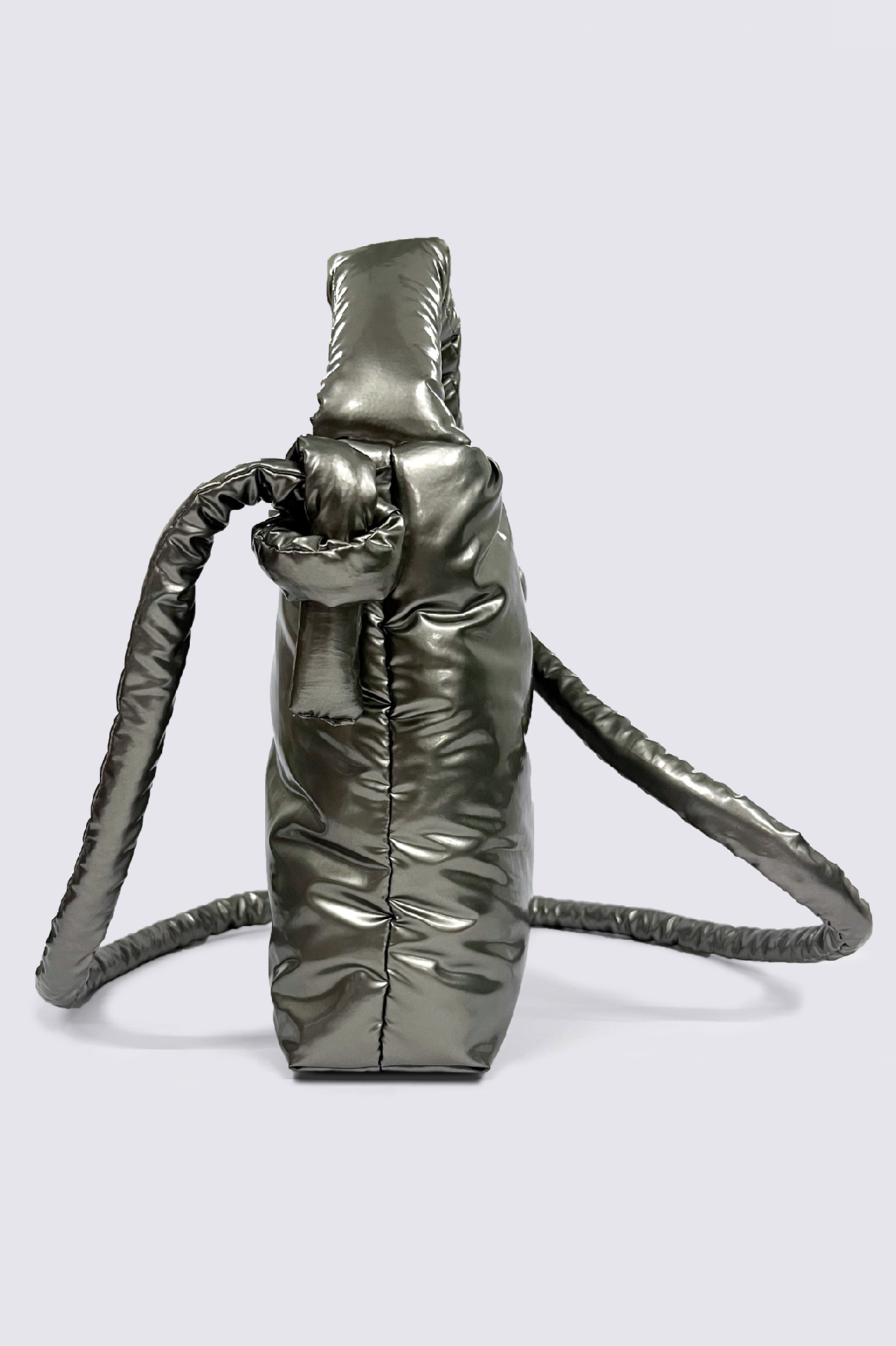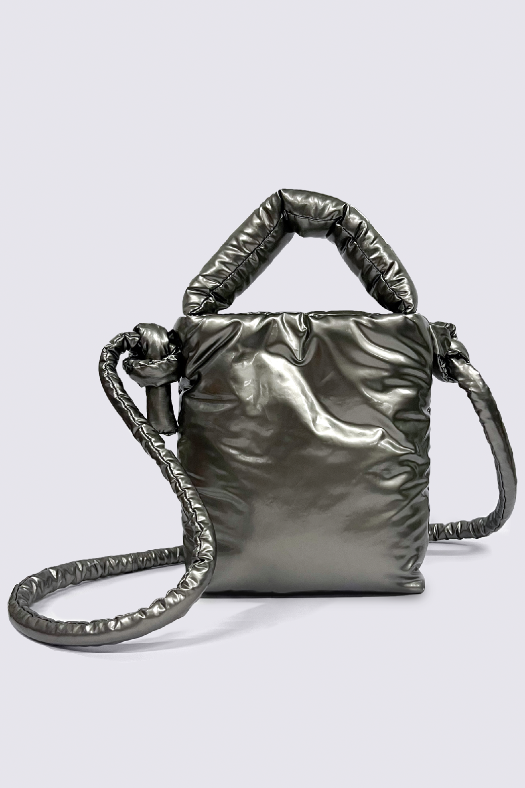 Toy bag in a silver waterproof polyester with a matte finish. Black polyester lining and a silver magnetic closure. The bag comes with an adjustable strap that can be knotted up to a desired length.