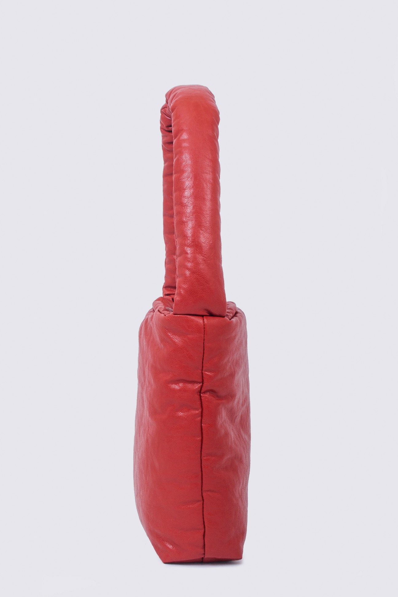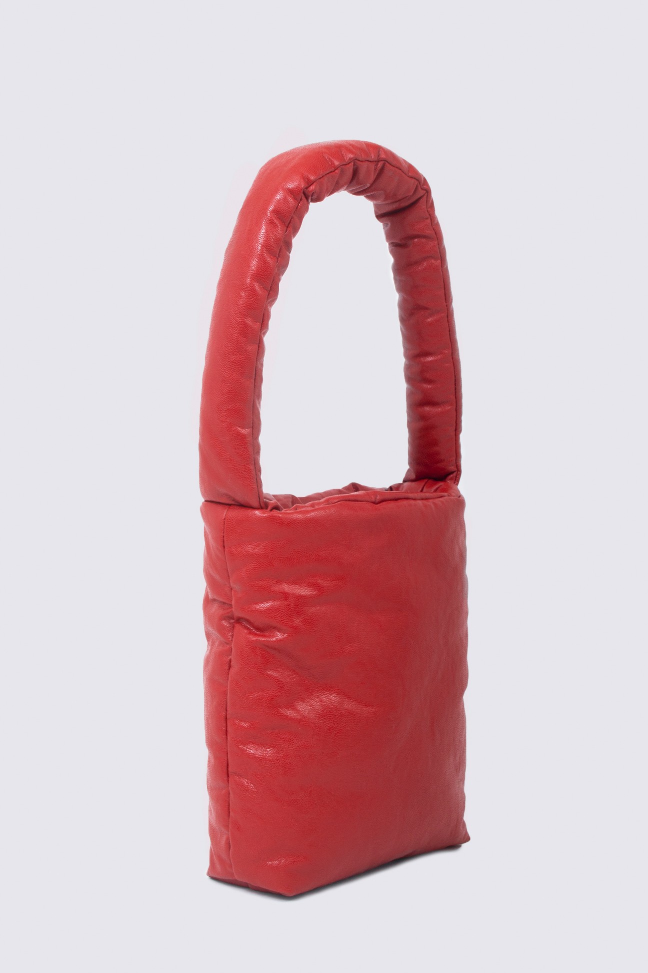 Dark ruby red Toy Bag made out of faux leather. Comes with black polyester lining, a silver magnetic closure and is waterproof. The bag is padded, creating a puffy look and feel.